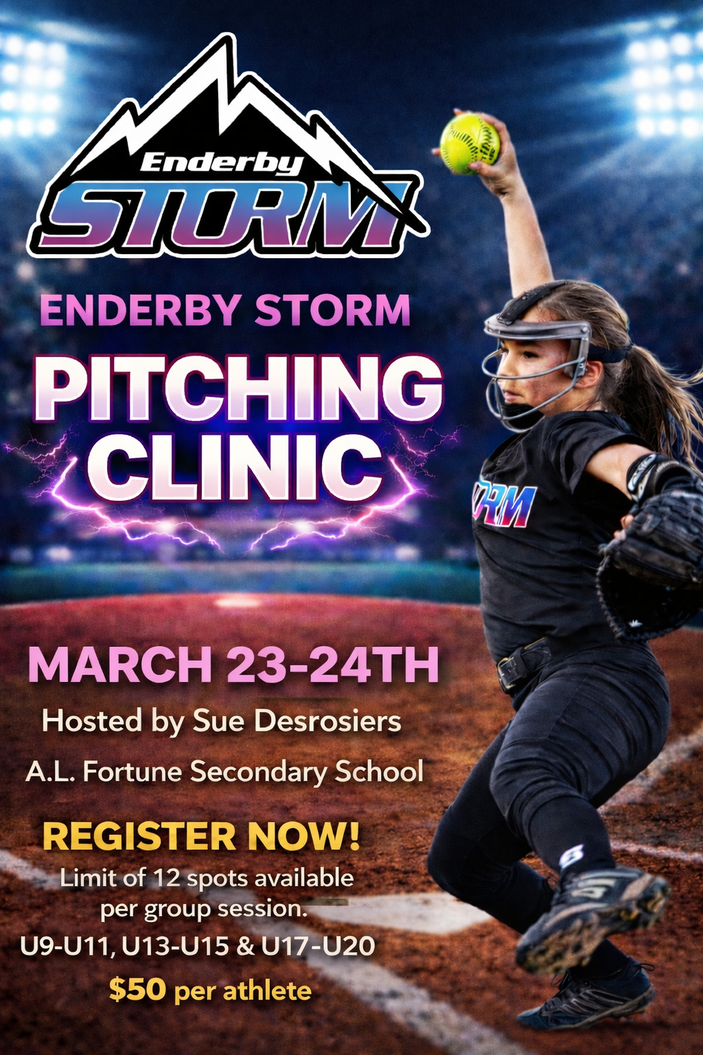 Enderby Storm is excited to have Sue Desrosiers provide a 2 day pitching clinic March 23-24th 2026 at AL Fortune Secondary School.